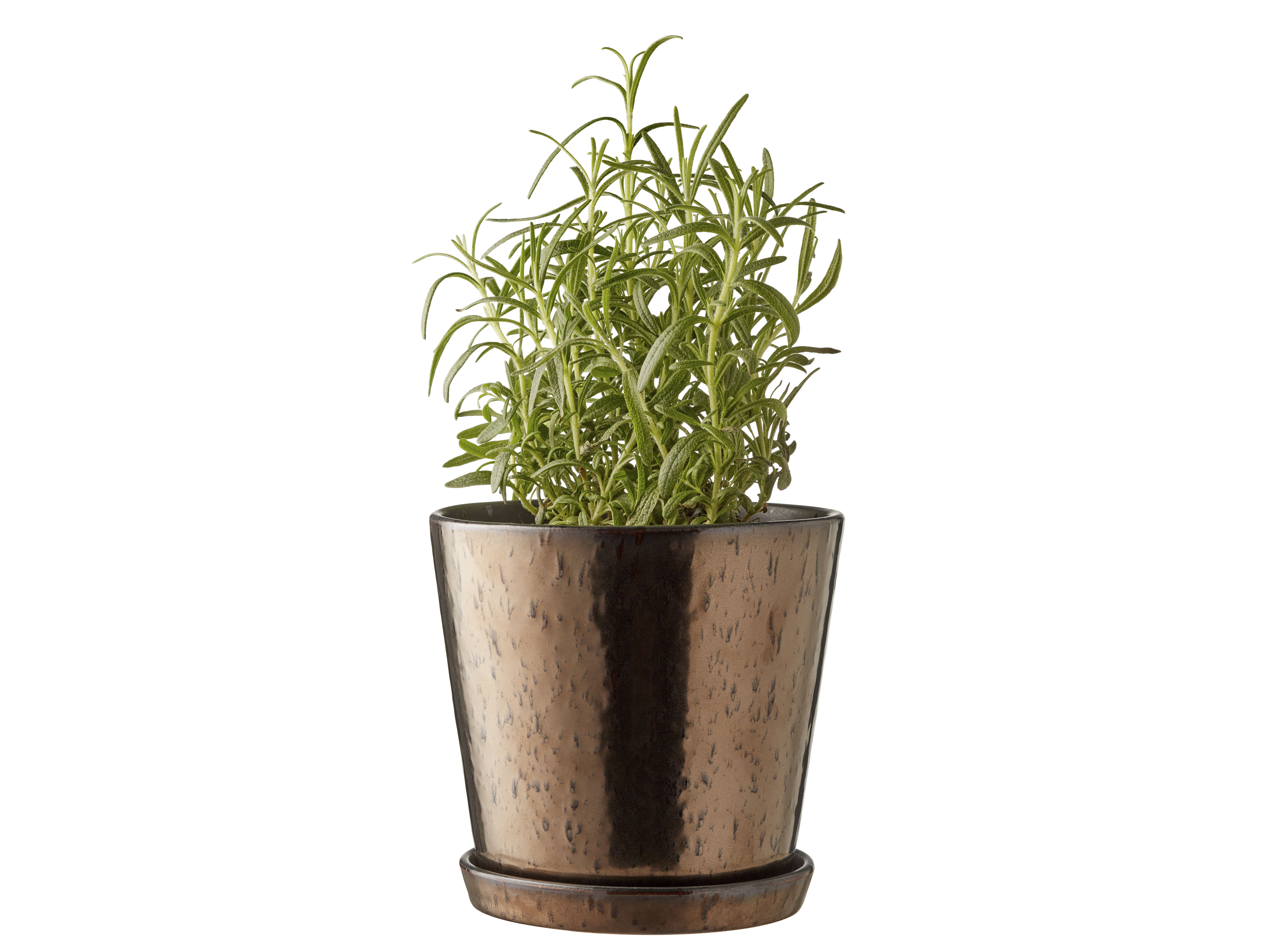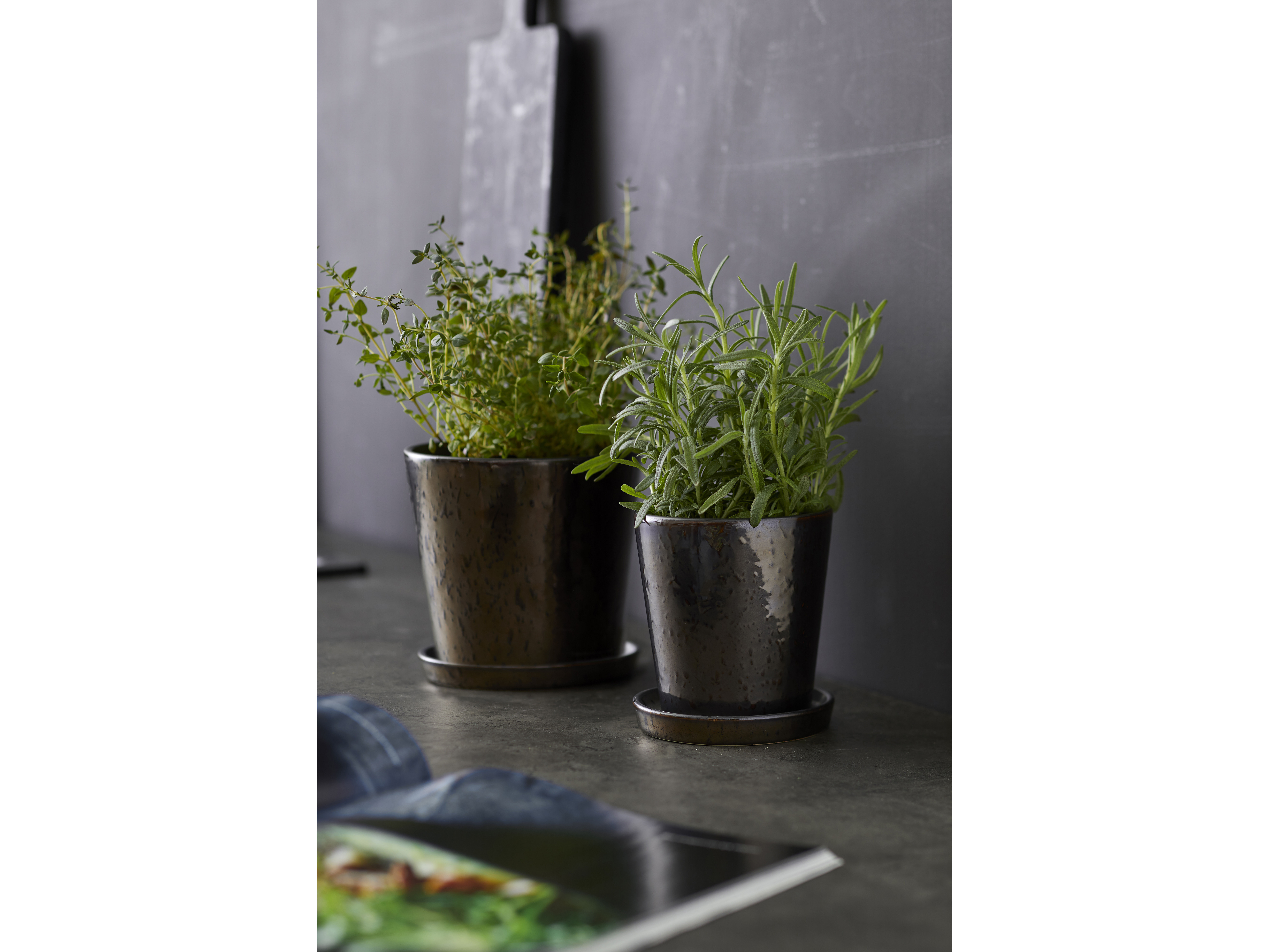 Der Übertopf aus Steinzeug mit passendem Untersetzer hat eine glänzende, bronzefarbene Glasur auf der Außenseite und eine matte, schwarze Glasur auf der Innenseite. Stellen Sie Kräuter oder Zimmerpflanzen in den Übertopf und schaffen Sie eine hübsche, grüne Stimmung auf der Fensterbank. Durchmesser 14 cm und Höhe 12,5 cm.