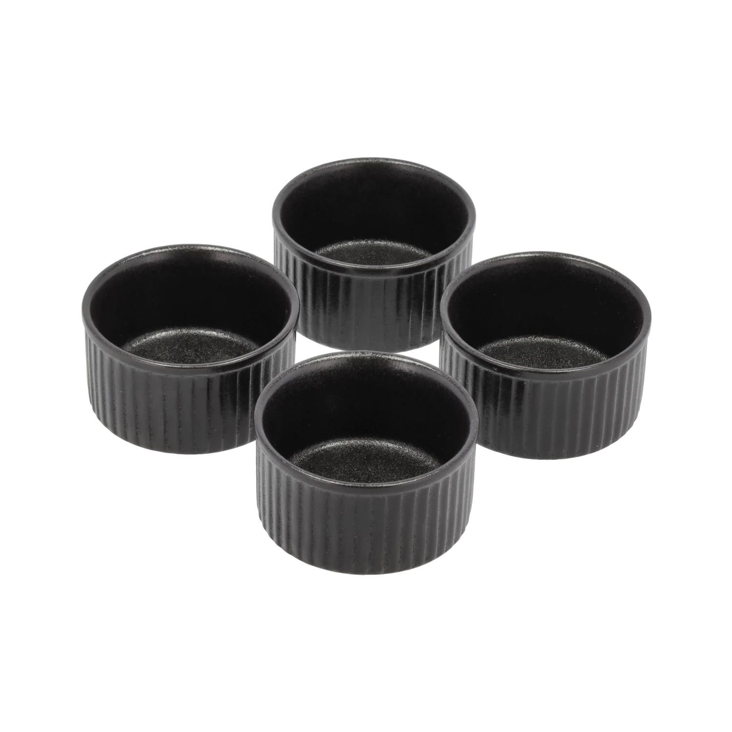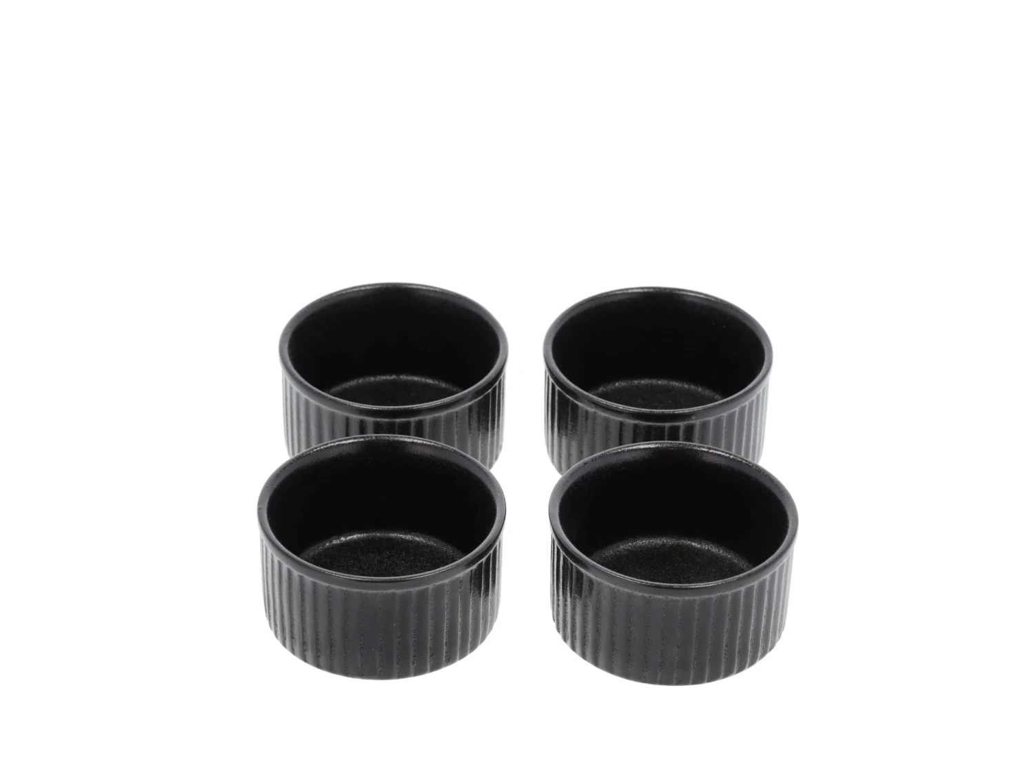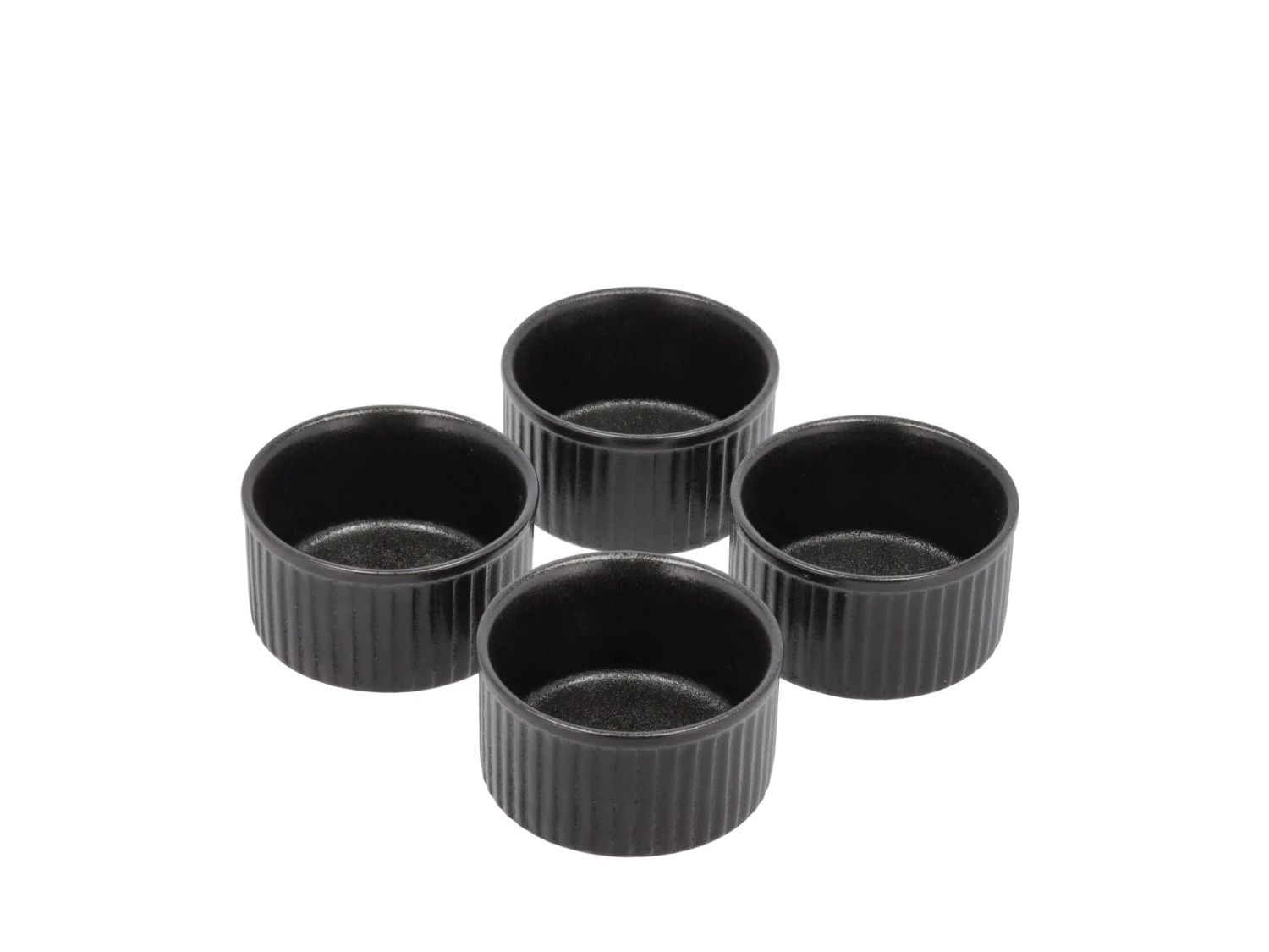 4 HOLM Ramekinformen aus schwarz glasiertem Steinzeug. Durchmesser 7 cm, Höhe 3,5 cm. Die Ramkinformen eignen sich für Soufflé, Gratin, Pastete, Marmelade, Tapenade und das Servieren in Portionen.