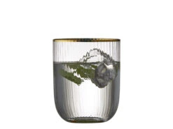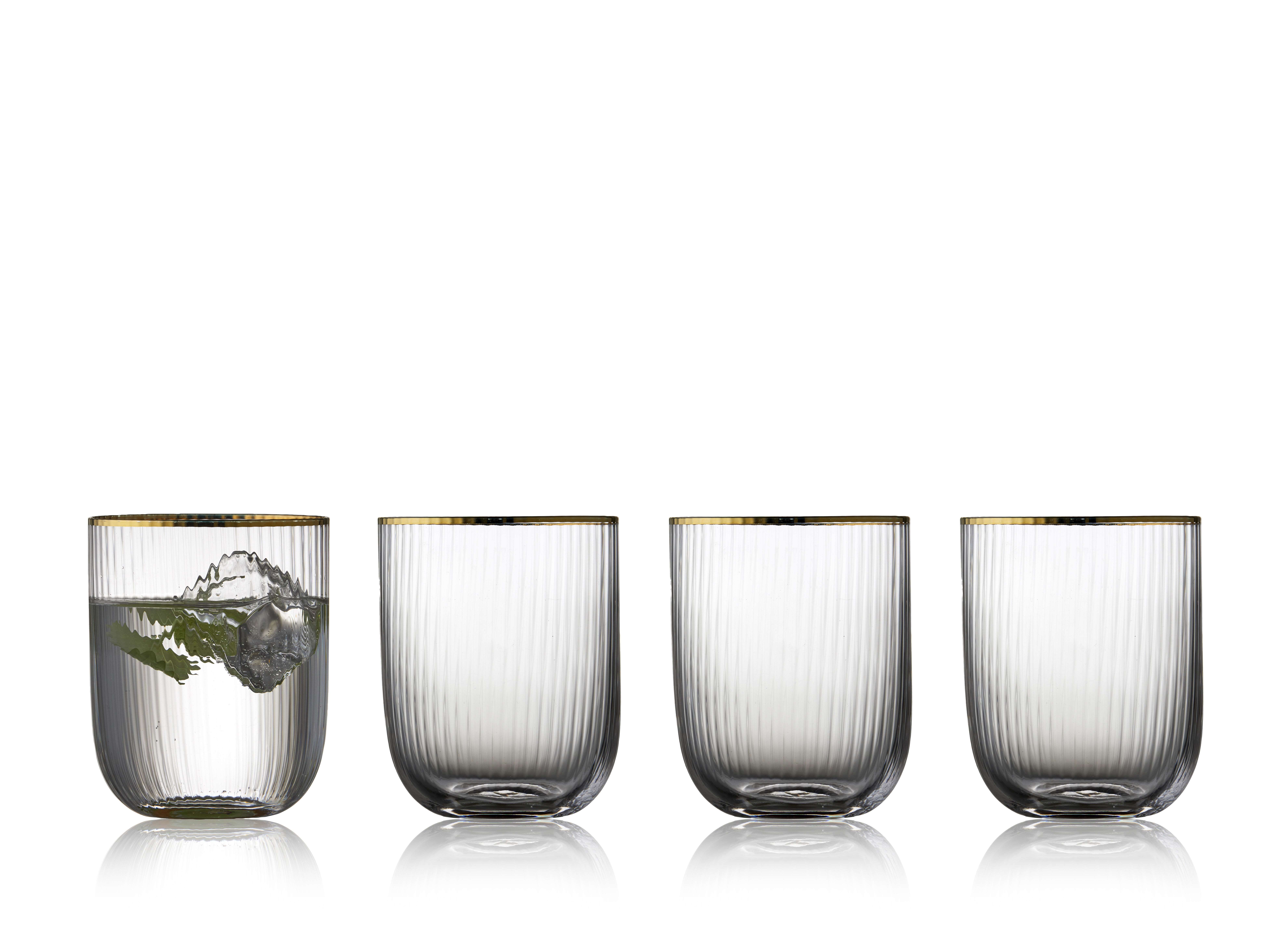 Hübscher Tumbler mit weichen, abgerundeten Formen. Das elegante, geriffelte Design mit hübscher Goldkante verleiht dem Glas einen tollen Vintage-Look, der gleichzeitig die Trends der Zeit widerspiegelt. Servieren Sie Wasser, Saft oder Drinks in den Gläsern und die hübschen Facetten reflektieren das Licht und den Inhalt der Gläser auf wunderschöne Art und Weise.