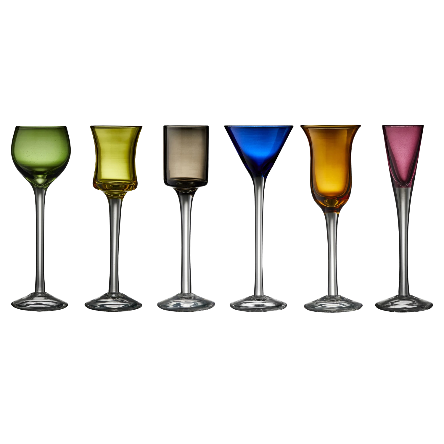 6 verschiedene durchgefärbte und mundgeblasene Schnapsgläser tragen zu einer guten Stimmung am Tisch bei, und es ist leicht, das eigene Glas wiederzufinden. Die Schnapsgläser sind unterschiedlich geformt und in den Farben Lila, Blau, Rauch, Bernstein, Grün und Gelb erhältlich. Sie können von 2,5 bis zu 5 cl enthalten. H 16 cm.