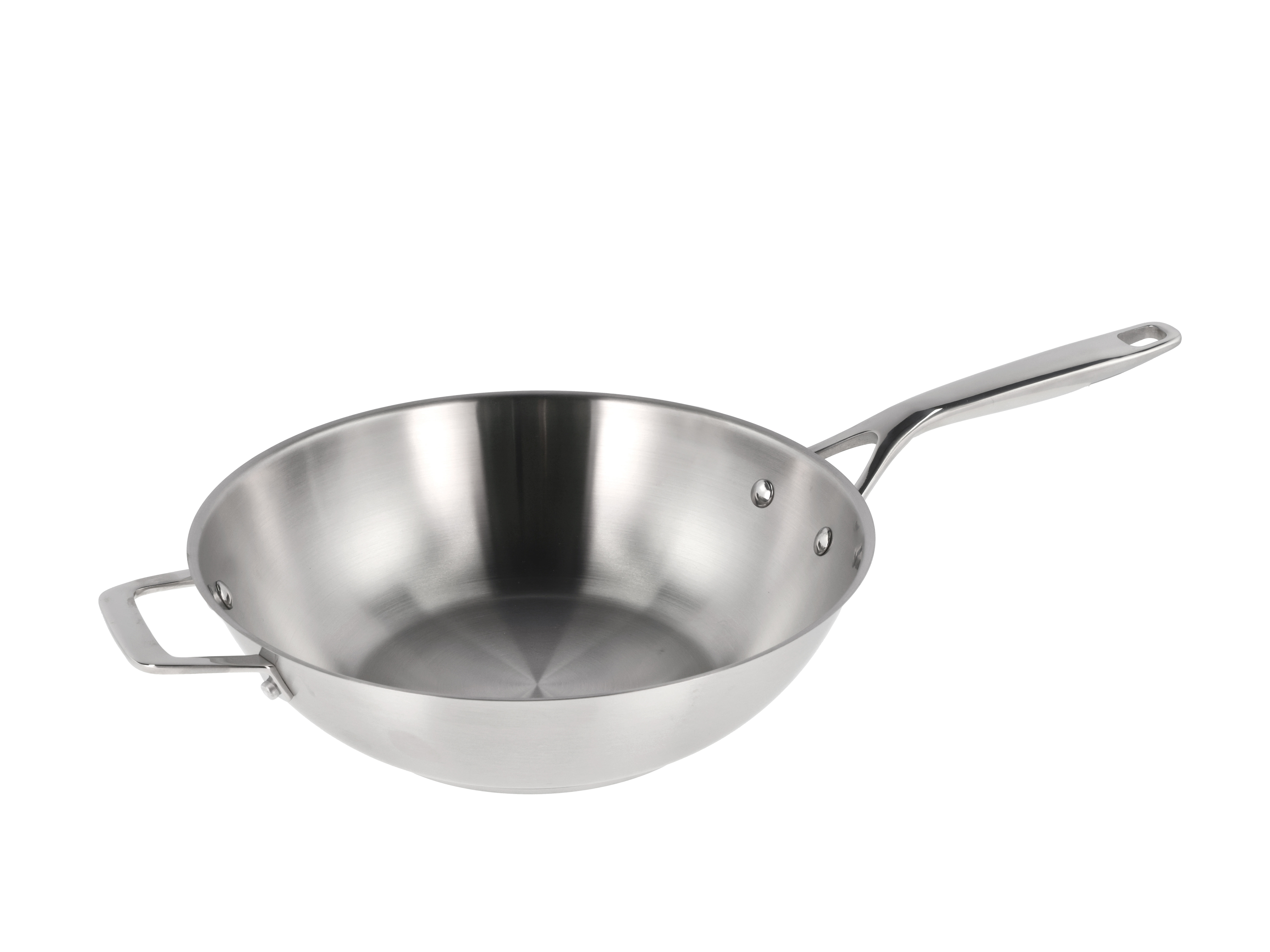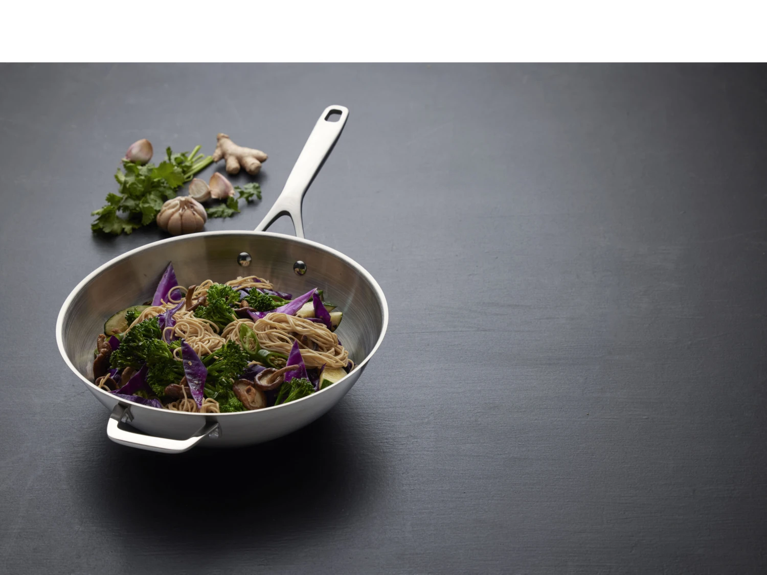 At the base of the wok is an aluminium core covered with stainless steel on both sides, also called a sandwich base, where the outer layer is magnetic. The heat is distributed and maintained in an even and energy-efficient way across the base. The wok can be used on any heat source – from traditional cooktops, glass ceramic and induction cooktops to electric and gas cookers. Dishwasher-safe. The pan is also oven-safe.