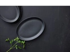 2 elegante Steak-Teller aus schwarz emailliertem Steinzeug. Die Teller haben eine hübsche, ovale Form mit einer höheren Kante auf der einen Seite, sodass sich die Sauce oder der Fleischsaft sammeln und auf dem Teller bleiben. Zum Servieren geeignet. Die Teller vertragen bis zu 250 Grad im Backofen. 28 x 20 cm.