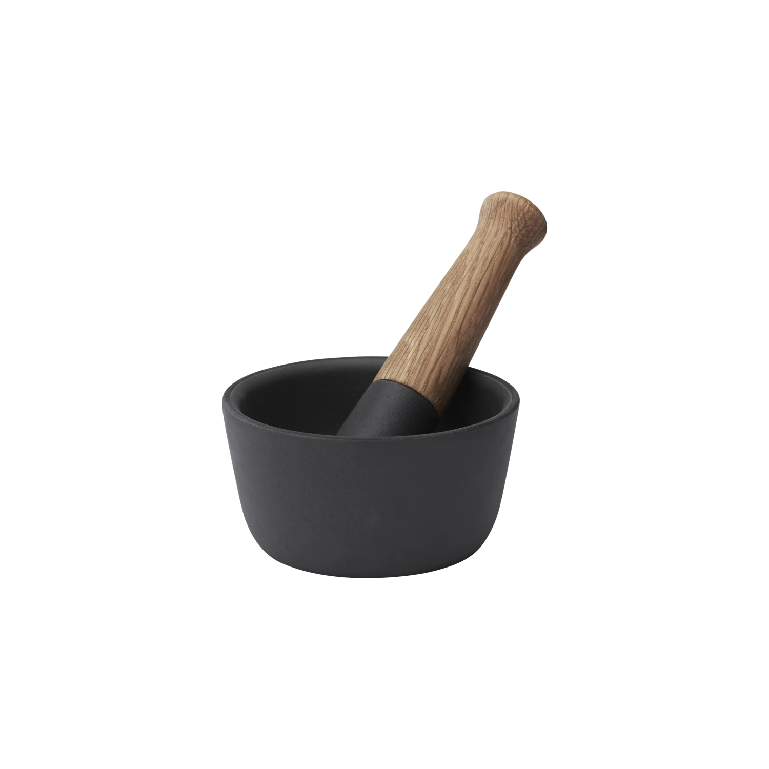 Funktioneller Mörser aus Gusseisen und Eiche. Das Design passt wunderbar zum Salzbehälter und der Pfeffermühle. Der Stößel ist 17,5 cm lang, während die Schale einen Durchmesser von 12 cm und eine Höhe von 6,5 cm hat.