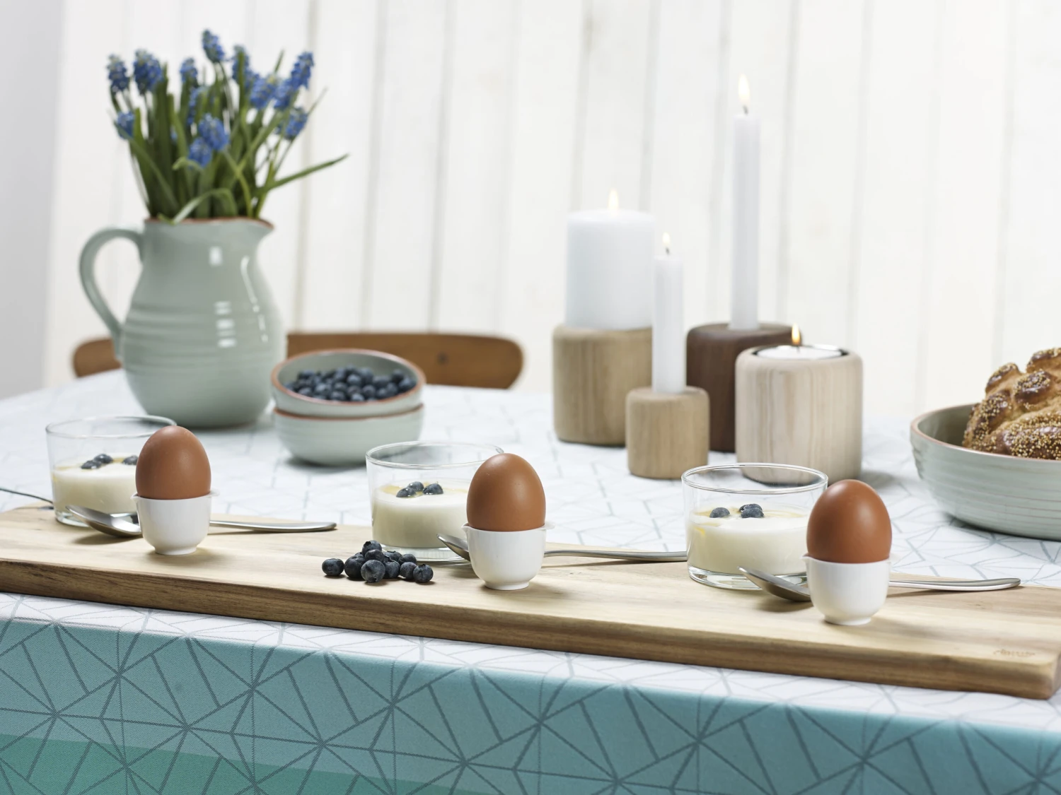 Das Design der Margrethe-Rührschüssel bildet die Inspiration für eine ganze Reihe von Eierbechern, die wie eine Miniaturausgabe der Margrethe-Rührschüssel geformt sind und auch ihren Namen tragen. Die Eierbecher sind formgegossen und können gestapelt werden. Sie sind aus praktischem und farbechtem ABS-Kunststoff hergestellt.