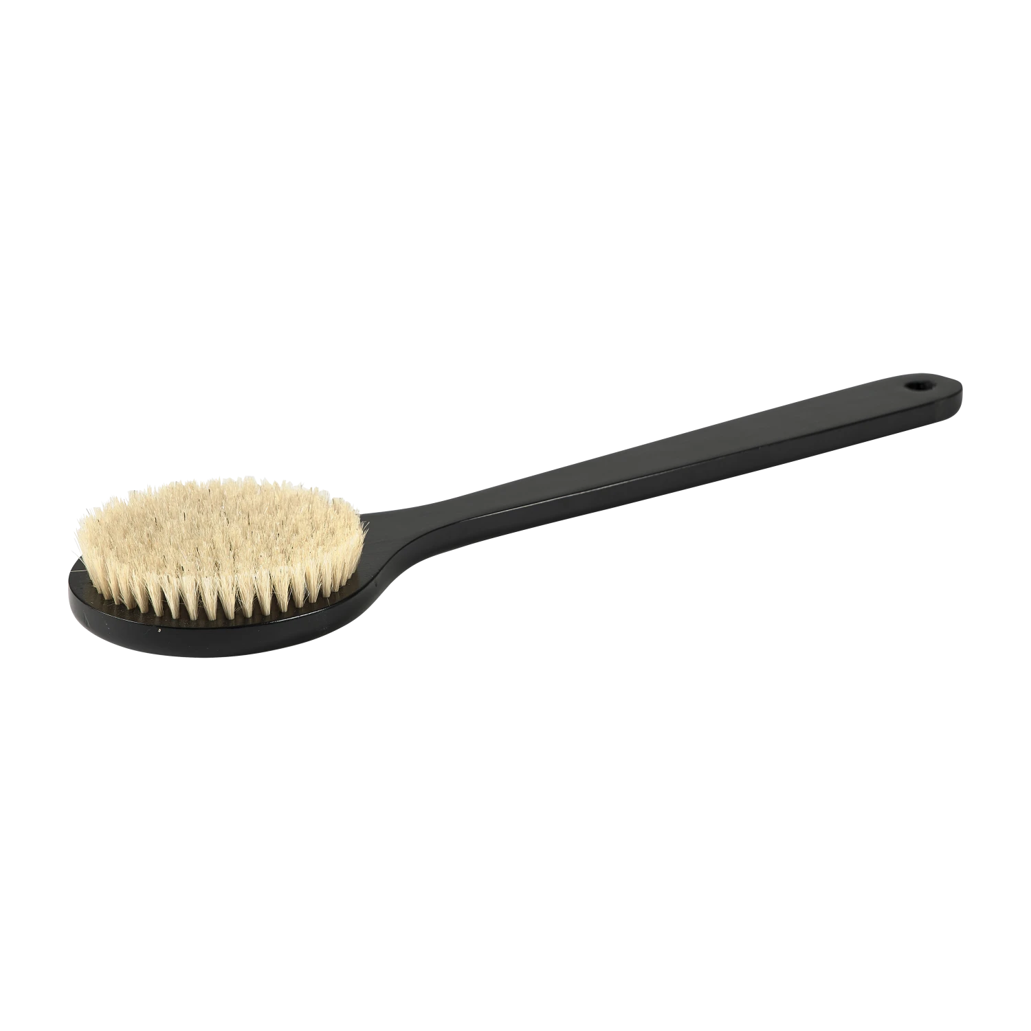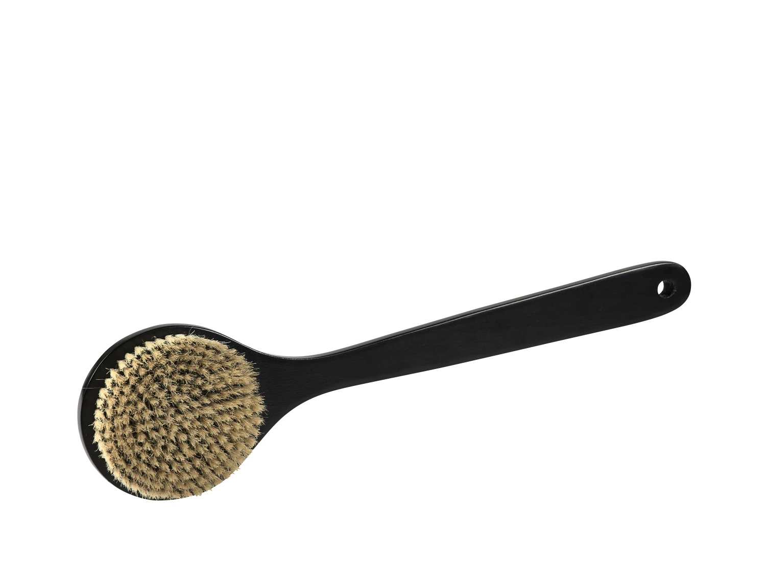 Hübsche Badebürste aus Schima-Holz, einem immergrünen Baum, der mit der Teebaum-Familie verwandt ist, und Borsten aus Naturhaar für ein sanftes Peeling.